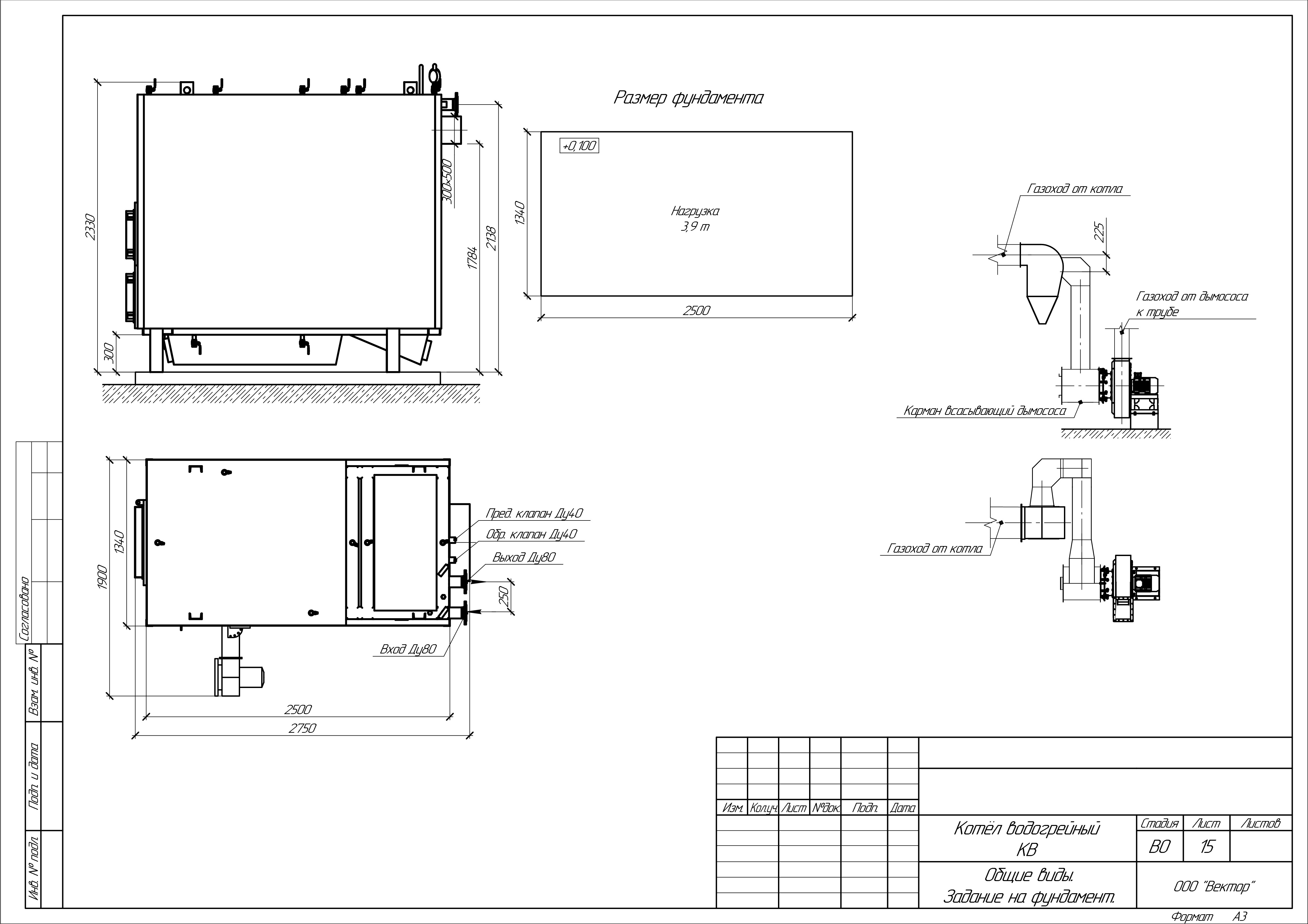 Дровяной котел КВр-1,05 c колосниковой решеткой устанавливается на специально подготовленный фундамент и крепится анкерными болтами. Важно обеспечить ровную установку котла и обеспечить воздухоподачу к топке. Далее котел присоединяется к средствам водоснабжения, устанавливается вся запорная арматура и КИП, устанавливаются система отвода газов и элементы управления.